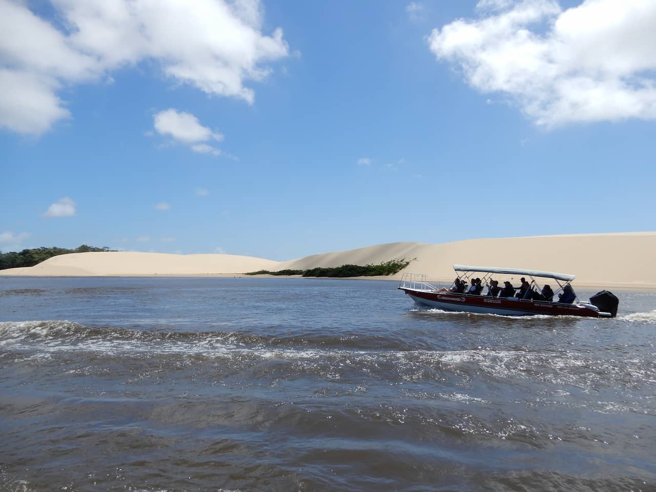 Esse foi, sem dúvida, um dos passeios mais marcantes da viagem. O circuito da Lagoa Bonita começa com um trajeto de cerca de 15 km em um 4×4, saindo de Barreirinhas. Desde março de 2025, não é mais preciso atravessar o Rio Preguiças de balsa, já que uma nova ponte facilita o acesso.