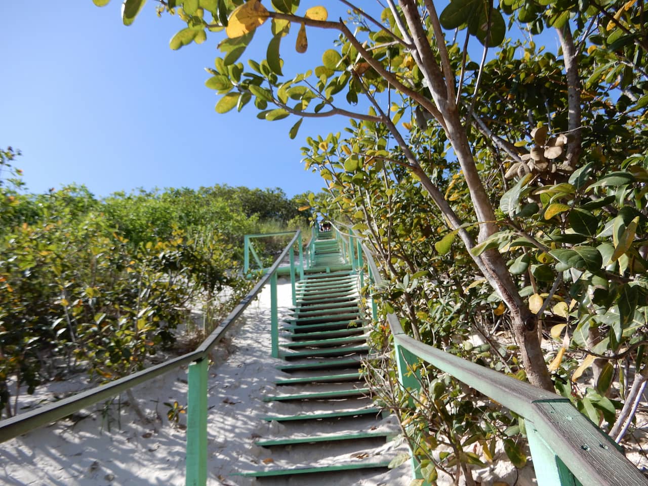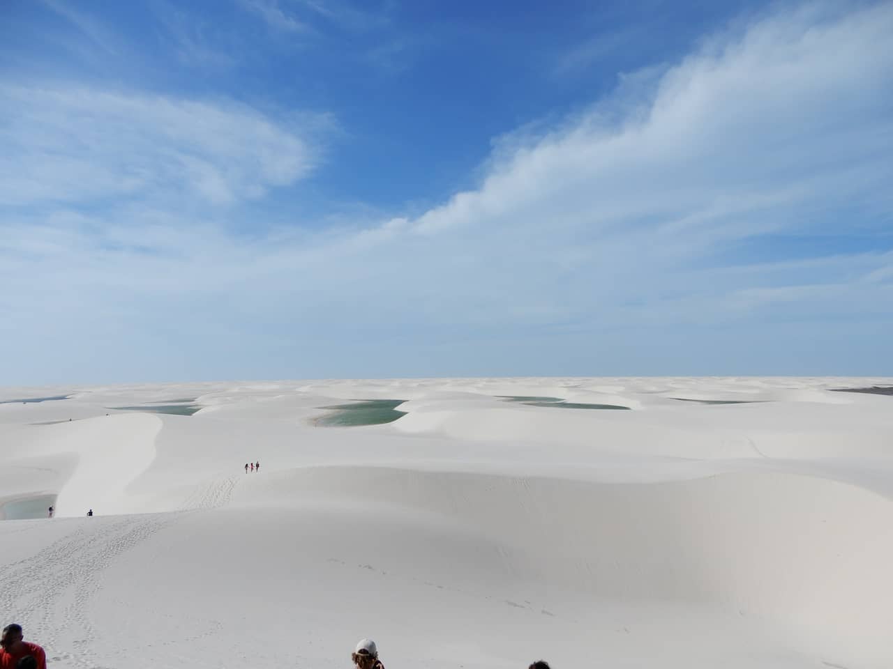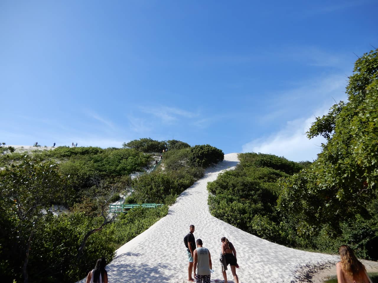 Depois do trecho de carro, vem a parte mais intensa: a subida pelas dunas, agora com uma escada de madeira que ajuda bastante. No alto, a vista é arrebatadora. Ver aquele mar de areia branca pontuado por lagoas cristalinas é uma sensação indescritível.